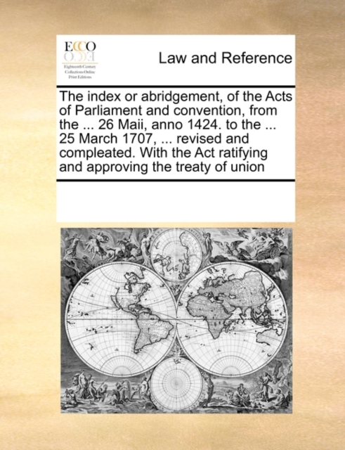 TITLE: The Index or Abridgement, of the Acts of Parliament and Convention, from the ... 26 Maii, Anno 1424. to the ... 25 March 1707, ... Revised and Compleated. with the ACT Ratifying and Approving the Trea