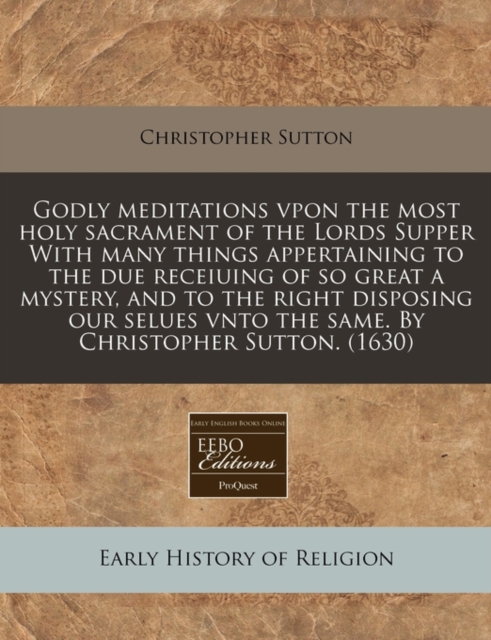 TITLE: Godly Meditations Vpon the Most Holy Sacrament of the Lords Supper with Many Things Appertaining to the Due Receiuing of So Great a Mystery, and to the Right Disposing Our Selues Vnto the Same. by Chr
