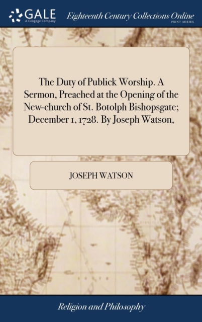 TITLE: The Duty of Publick Worship. a Sermon, Preached at the Opening of the New-Church of St. Botolph Bishopsgate; December 1, 1728. by Joseph Watson,
