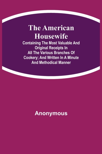 TITLE: The American Housewife; Containing the Most Valuable and Original Receipts in All the Various Branches of Cookery; and Written in a Minute and Methodical Manner